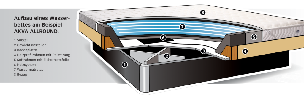 Ein Wasserbett besteht aus einem Unterbau mit einer Bodenplatte und einem Heizelement. Die Gewichtsverteilung sorgt dafür, dass das Bett stabil steht und das Heizsystem unter der Sicherheitsfolie für die optimale Temperatur sorgt.